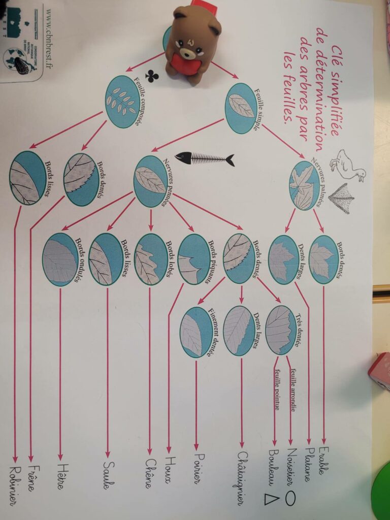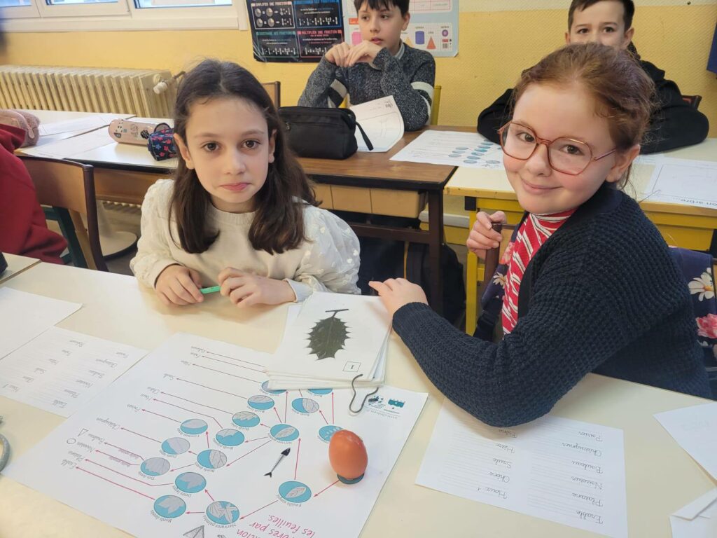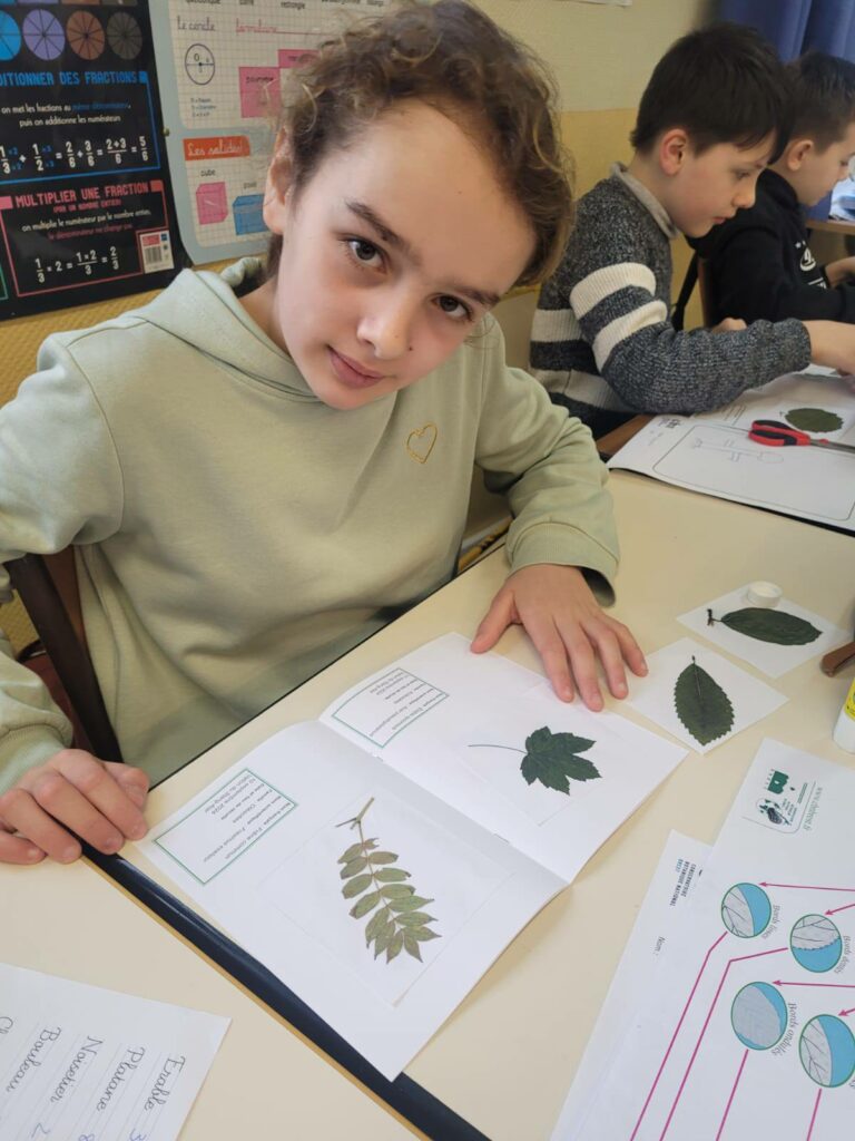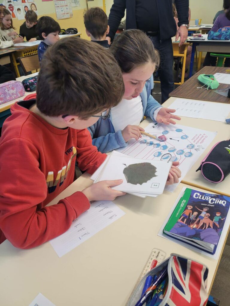 La séance a débuté par un jeu basé sur l’observation des feuilles, permettant aux élèves de déterminer à quelles espèces d’arbres elles appartiennent. À travers cette activité ludique et scientifique, les enfants ont appris à reconnaître les formes, nervures et particularités des feuilles.