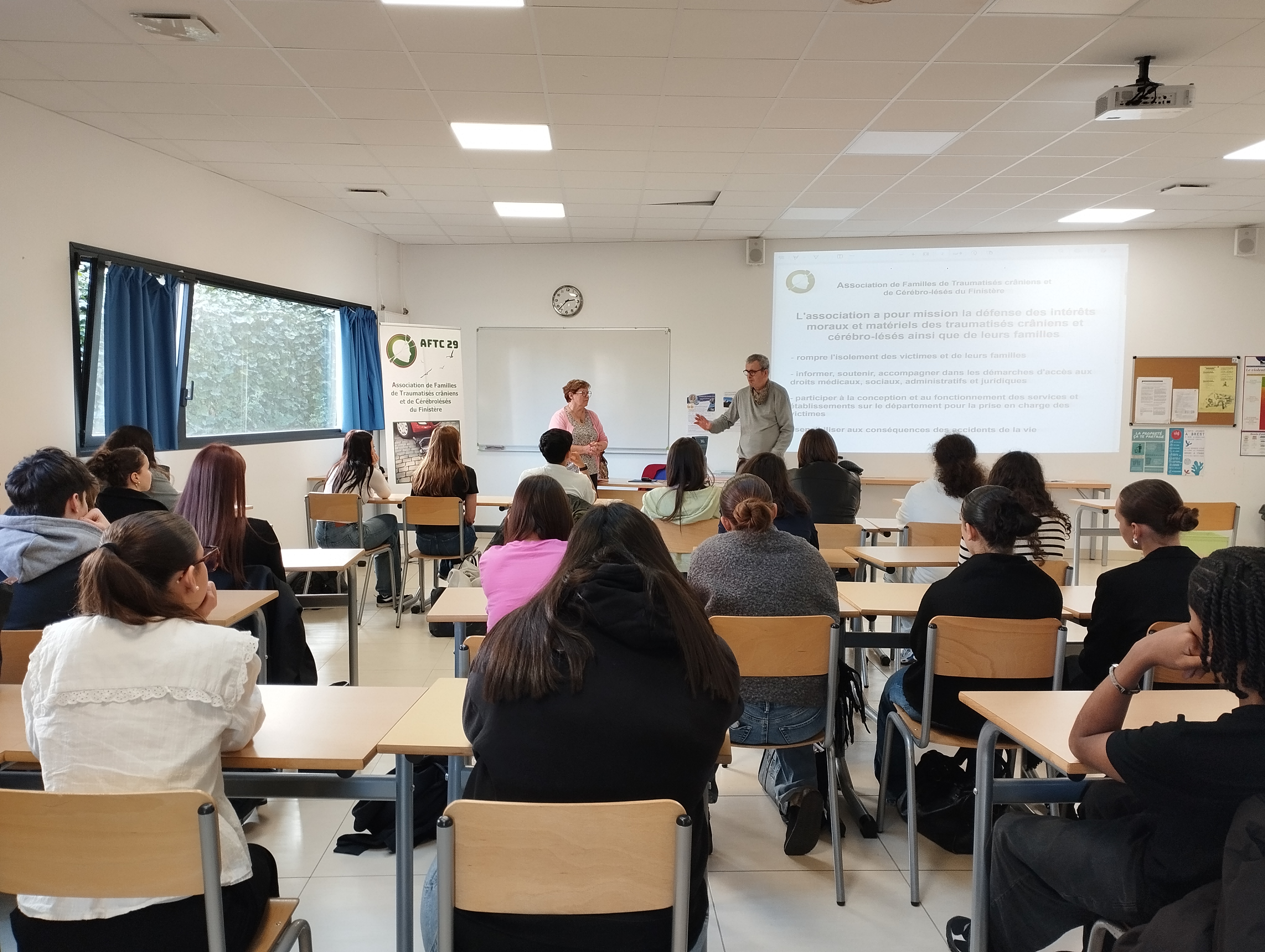 Les élèves ont ensuite assisté à des témoignages poignants proposés par deux intervenants de l’Association des Familles de Traumatisés Crâniens du Finistère. Mme Perrot et M. Saliou ont partagé des expériences de vie bouleversantes, permettant aux élèves de mesurer concrètement les conséquences des accidents de la route.